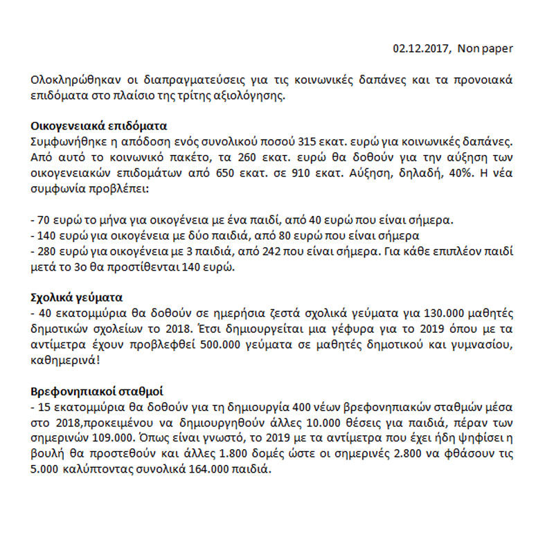 - 15 εκατομμύρια θα δοθούν για τη δημιουργία 400 νέων βρεφονηπιακών σταθμών μέσα στο 2018,προκειμένου να δημιουργηθούν άλλες 10.000 θέσεις για παιδιά, πέραν των σημερινών 109.000. Όπως είναι γνωστό, το 2019 με τα αντίμετρα που έχει ήδη ψηφίσει η βουλή θα προστεθούν και άλλες 1.800 δομές ώστε οι σημερινές 2.800 να φθάσουν τις 5.000 καλύπτοντας συνολικά 164.000 παιδιά. Διαβάστε το non paper της κυβέρνησης